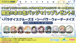 「パラダイスクルーズⅡ」もしくは「ウォーターメイズ」体験の際、「シーパラたんけん!おでけけラリー」のスタンプラリーシートのご提示で「ホロ缶バッジ」を1つプレゼントします。