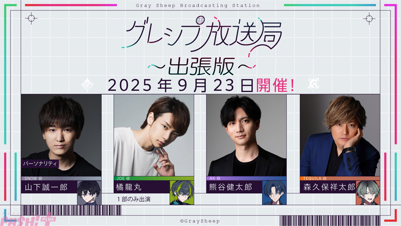 2025年9月23日(火・祝)に開催される公式WEBラジオ『グレシプ放送局』の公開録音イベント『グレシプ放送局出張版』の追加出演者が決定! JOE(ジョー)役の橘龍丸さんとTEQUILA(テキーラ)役の森久保祥太郎さんの2名が登壇します。