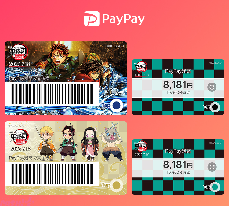 「送る・受け取る」画面のデザイン変更と共に、PayPay アプリのホーム画面に表示されるバーコード部分の「カードきせかえ」も期間限定で実装します。『劇場版『鬼滅の刃』無限城編』第1弾キービジュアルの炭治郎・義勇が表示されるKVver.と炭治郎・禰豆子・善逸・伊之助4人のみにキャラたちが表示されるキャラVer.の2種類を設定できます。