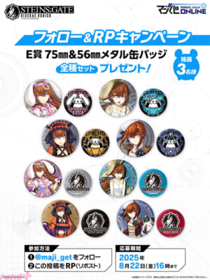 期間中に「マジゲット/マジくじ公式」の公式X(旧Twitter)をフォロー&対象の投稿をリポストした人の中から抽選で3名に「E賞:75mm&56mmメタル缶バッジセット コンプリートセット」をプレゼント!
