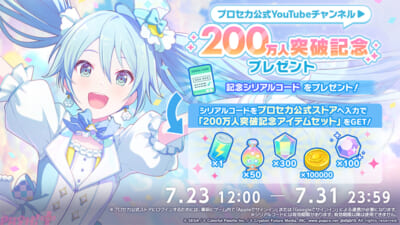 プロセカ公式YouTubeチャンネルの登録者数が200万人を突破した記念として、7月31日(木)23:59までにログインした方に、「ライブボーナスドリンク(大)」×1個、「ミラクルジェム」×50個、「クリスタル」×300個、「コイン」×100,000枚、「想いのカケラ」×100個がセットになった「200万人突破記念アイテムセット」をプレゼントします。