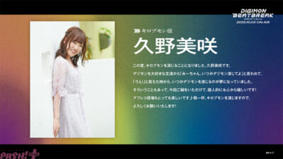 そういうこともあって、今回ご縁をいただけて、個人的にも心から嬉しいです! アフレコ現場もとっても楽しいです♪ 精一杯、キロプモンを演じますので、よろしくお願いいたします!