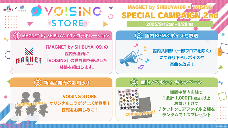 キャンペーン期間中は、「MAGNET by SHIBUYA109」の館内はもちろん、屋外広告にも「VOISING」メンバーが登場し、『VOISING STORE』だけでなく、館内全体が「VOISING」一色に染まります。さらに、館内店舗にて税込1,000円以上購入すると、限定ノベルティ(全2種)のうち、いずれか1つをランダムでプレゼント!