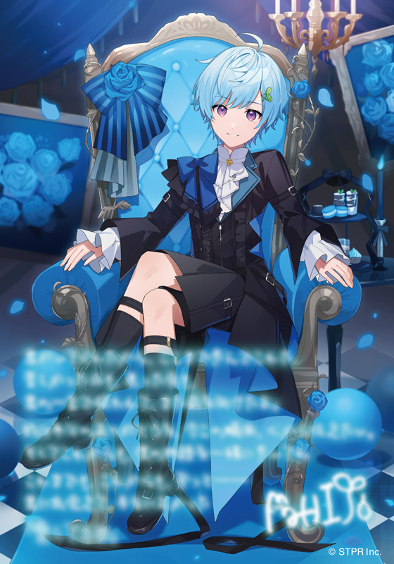 昨年のかわいらしいポップなビジュアルから一転、今年はゴシック系の衣装に身を包み、豪華な椅子に軽やかに座るイラストでバースデーグッズに登場! 可愛さとかっこよさを合わせ持つ「まひとくん。」が印象的です。