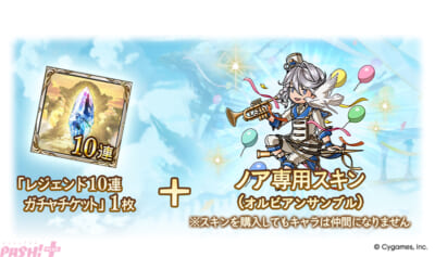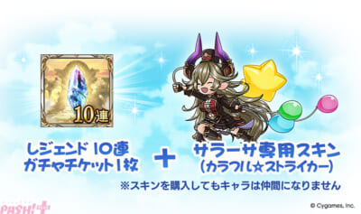 本キャンペーンでは「レジェンド10連ガチャチケット」1枚と「キャラ専用スキン」1種類のセットを、3,000モバコイン、3,000グラブルコイン、3,000GREEコイン、3,000DMMポイントのいずれかで購入することができます。1人1回のみの販売です。