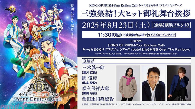 6月27日(金)より全国上映中の劇場アニメ『KING OF PRISM-Your Endless Call-み~んなきらめけ!プリズム☆ツアーズ』の大ヒットを記念した舞台挨拶と、8月22日(金)より上映が決定した SCREENX・4DX・ULTRA 4DX版『も~っとつながる! KING OF PRISM-Your Endless Call-み~んなきらめけ!プリズム☆ツアーズ』の公開を記念した舞台挨拶イベントがそれぞれ8月23日(土)に開催することが決定しました。