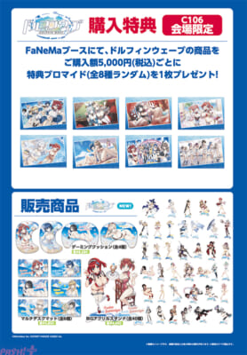 また、FaNeMaブースにて『ドルフィンウェーブ』関連商品を5,000円(税込)購入毎に、特典ブロマイド(全8種)をランダムで1枚プレゼント!