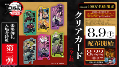全国劇場にて公開中の『劇場版「鬼滅の刃」無限城編 第一章 猗窩座再来』の来場御礼入場者特典第2弾として「クリアカード」の配布が決定しました。全国合計400万名限定での配布となります。キャラクターの組み合わせ別のデザインとなっており、全6種から1つをランダムで配布します。