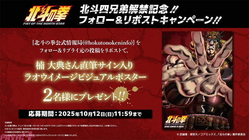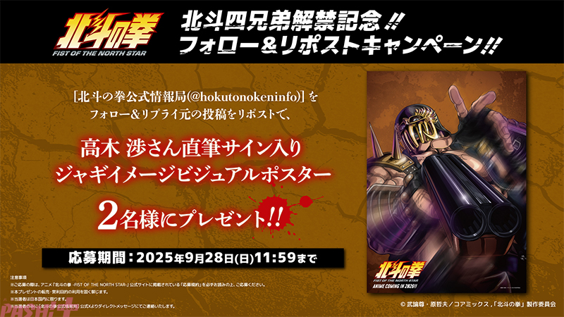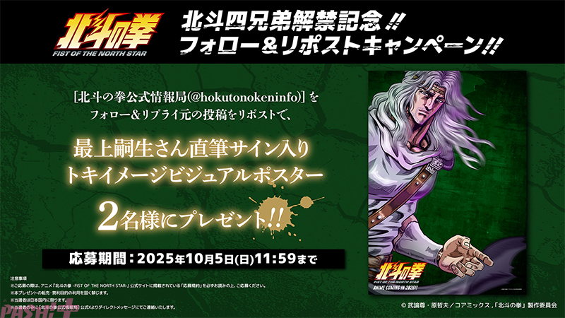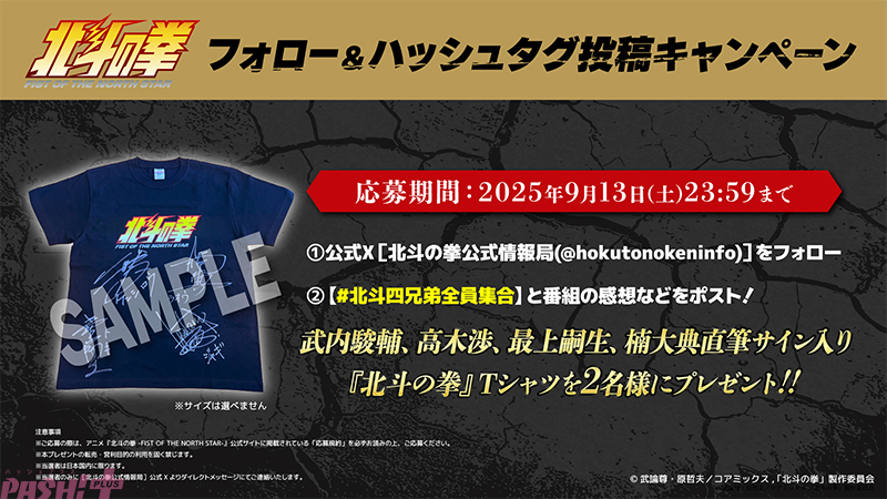 公式X(旧Twitter)をフォローして、【#北斗四兄弟全員集合】と番組の感想などをポストした人の中から抽選で、武内駿輔さん、高木渉さん、最上嗣生さん、楠大典直筆さんサイン入り『北斗の拳』Tシャツを2名にプレゼント!