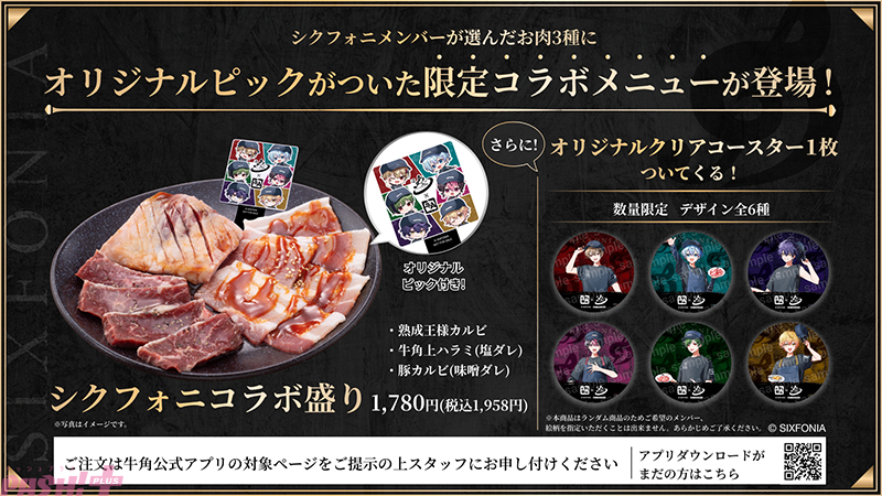 本コラボでは、“まるでシクフォニのメンバーが牛角スタッフの制服を身にまとい、本当に牛角で働いているかのような”世界観を表現。コラボ限定メニューや描き下ろしビジュアル、オリジナルノベルティの展開に加え、アプリやSNSを通じてデジタルでも楽しめるコンテンツが用意されています。
