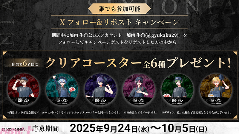 2.5次元タレントグループ「シクフォニ」とレインズインターナショナルが展開する焼肉チェーン「牛角」の初のコラボが決定しました。記念として、2025年9月24日(水)~10月22日(水)の期間に牛角全店舗にてコラボキャンペーンが開催されます。