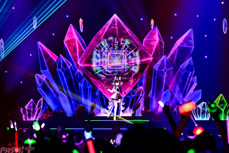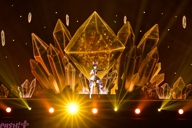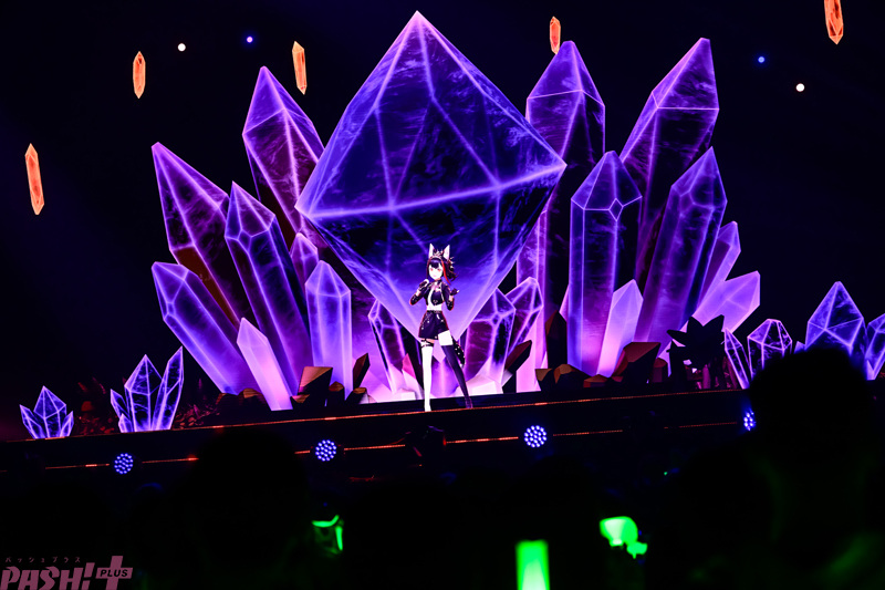 ステージ上にはミオファの森を思わせる木をあしらった装飾に加え、彼女が好きな鉱石のモチーフが設置され、それが様々な色に輝くことで照明の役割を果たしている。ゆかりの深いものや普段から好きを公言している要素がぎっしりと詰まった雰囲気だ。