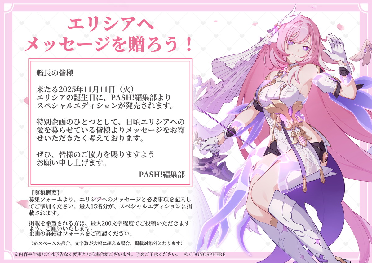 エリシアへの愛のメッセージを募集中。届いたメッセージはPASH!編集部とHoYoverseを通してエリシアに届けられるほか、最大15名分が特集記事内に掲載されます! 掲載された艦長さんには、ゲーム内アイテム「水晶×800」のプレゼントも!!
