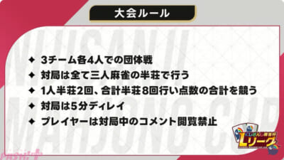 ルイス・キャミー主催の「にじさんじ麻雀杯 Lリーグ」は、にじさんじ麻雀初の三人麻雀大会。3チーム各4人での団体戦となっており、各チームのコーチおよび実況解説としてプロ雀士の渋川難波さん(実況解説)、多井隆晴さん、松本吉弘さん、日向藍子さんも参加し、コーチ部屋配信も実地されました。