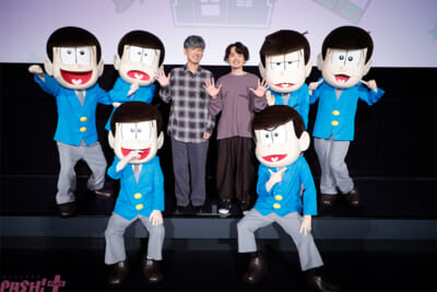 TVアニメ『おそ松さん』の10周年イヤー初日に、おそ松役を務める声優の櫻井孝宏さん、シリーズ構成・松原秀さん、そして6つ子(着ぐるみ)が登壇する上映イベントが新宿ピカデリーにて開催。