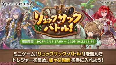 Cygamesとサイゲームスの子会社であるCyDesignationとの共同制作によるソーシャルゲーム『グランブルーファンタジー』にて、期間限定イベント「リュックサック・バトル!」が2025年10月15日(水)17:00~2025年10月22日(水)16:59の期間、復刻開催中です。