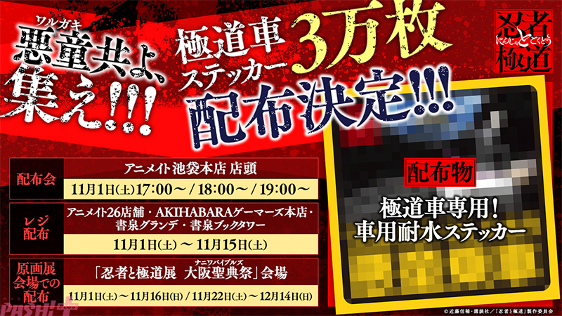 アニメイト26店舗・AKIHABARAゲーマーズ本店・書泉グランデ・書泉ブックタワーでの配布のほか、11月1日(土)にアニメイト池袋本店での配布会も開催。さらに、原作コミックスの原画展「忍者と極道展 大阪聖典祭(ナニワバイブルズ)」会場でも配布されます。ステッカーのデザインは後日公開となります。