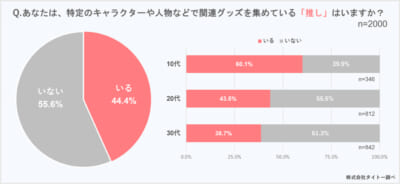 10代~30代の男女で、関連グッズを集めている「推し」が「いる」という割合は、44.4%となり、「いない」(55.6%)という割合が若干高い結果となった。世代別では、10代(60.1%)、20代(43.5%)、30代(38.7%)と年代が高くなるほど、割合は減少している。