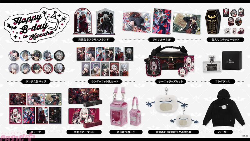 「Happy B-day to Kuzuha」のグッズラインナップは、背景付きアクリルスタンド、アクリルパネル、ランダム缶バッジ、ランダムフォト風カード、缶入りステッカーセット、にじぱぺポーチ、にじぬい/にじぱぺかぶりもの、フレグランス、サーニャグッズセット、スリーブ、大判ラバーマット、パーカーの12種類です。
