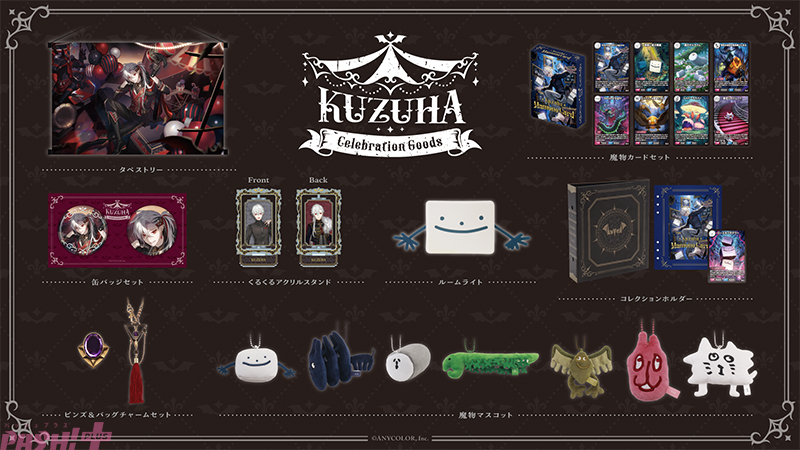 「Kuzuha Celebration Goods」のグッズラインナップは、タペストリー、缶バッジセット、くるくるアクリルスタンド、ピンズ&バッグチャームセット、魔物マスコット、ルームライト、魔物カードセット、コレクションホルダーの8種類。