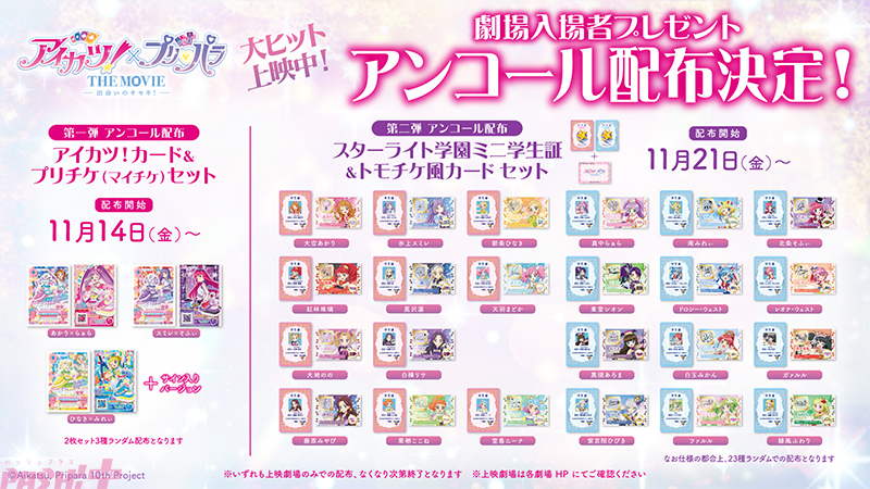 第一弾でプレゼントしました「アイカツ!カード&プリチケ(マイチケ)2枚セット」と、第二弾でプレゼントしました「スターライト学園ミニ学生証&トモチケ風カード2枚セット」ですが、大変多くの反響をいただきまして、アンコール配布が決定しました。