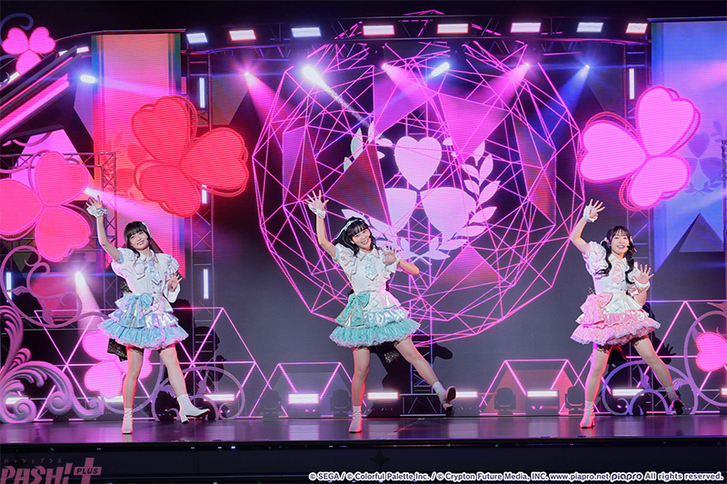 バーチャル・シンガーの男性陣による『フュージョン』(鏡音レン、KAITO)は、『あんさんぶるスターズ!!』とのコラボによって生まれた楽曲。キレ味鋭いふたりのダンスの中で繰り出される「みんなの心を撃ち抜いちゃうよ」の言葉に悲鳴にも似た黄色い歓声が上がります。