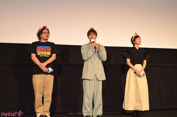 ナレーションを務める井ノ原さん、本上さん、監督のイワタナオミさんの順で登壇。ハロウィンということで、“えびふらいのしっぽカチューシャ”をつけて登場しました井ノ原さんは「お忙しい中初日に来てくれてありがとうございます!」、本上さんは「皆さんとお会いできて本当にうれしいです。」、イワタさんは「ドキドキしながら来たんですが、お客様の顔が見れて安心と嬉しさが混じっていろんな感情になっています」と、それぞれ喜びを語りました。