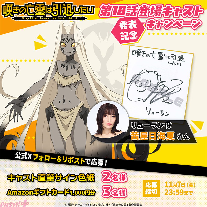 第18話登場キャスト発表を記念して、茜屋日海夏さん(リューラン役)の直筆サイン入り台本やAmazonギフトカード1,000円分が当たるキャンペーンが実施されます。