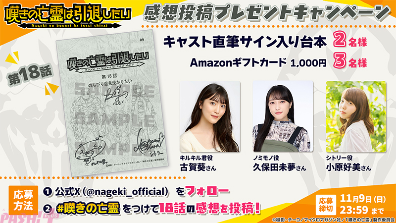 第18話の放送を記念して、小原好美さん(シトリー・スマート役)、古賀葵さん(キルキル君役)、久保田未夢さん(ノミモノ役)の直筆サイン入り台本やAmazonギフトカード1,000円分が当たるキャンペーンが実施されます。