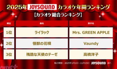 The post Mrs.GREEN APPLEが“四冠制覇”で2025年を象徴! NEWS、timelesz、CUTIE STREET、=LOVEも躍進の「2025年JOYSOUNDカラオケ年間ランキング」が発表 first appeared on PASH! PLUS.