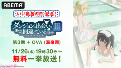 ABEMAは、2025年11月26日(水)の「いい風呂の日」当日に、大人気アニメ『ダンジョンに出会いを求めるのは間違っているだろうか(ダンまち)』シリーズの“温泉回”第3期OVAを含む、第3期全話を無料一挙放送します。