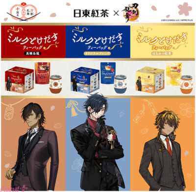 今回のラインナップは燭台切光忠、大倶利伽羅、火車切の刀剣男士たちが登場。パッケージには刀剣乱舞十周年を記念して描き下ろされた新たな装い「祝装」の3振りがデザインされており、その中にコラボデザインのステンレスタンブラーと日東紅茶商品を詰め合わせました。この特別なセットで優雅なティータイムをお楽しみください。