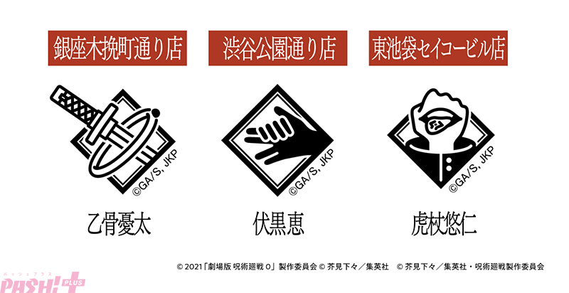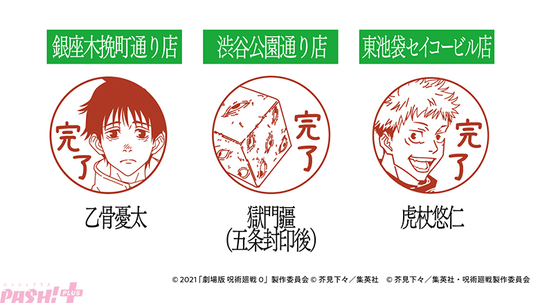 各店舗で違うデザインが用意されており、東池袋セイコービル店では虎杖悠仁、銀座木挽町通り店では、乙骨憂太の「完了印」を押印してもらえます。また、渋谷公園通り店では獄門疆の「完了印」で“封”印してもらえます。