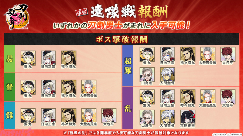 各難易度の合戦場のボスを撃破すると、まれに下記の刀剣男士も入手できます。