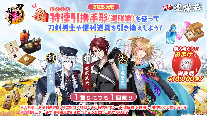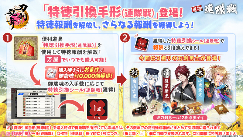 便利道具「特徳引換手形(連隊戦)」を購入すると「連隊戦」の特徳報酬を解放できるほか、おまけとして「御歳魂」を10,000個獲得できます。特徳報酬を解放すると「御歳魂」の入手数に応じて「特徳引換シール(連隊戦)」を入手できます。「特徳引換シール(連隊戦)」は、刀剣男士や便利道具と引き換えができます。