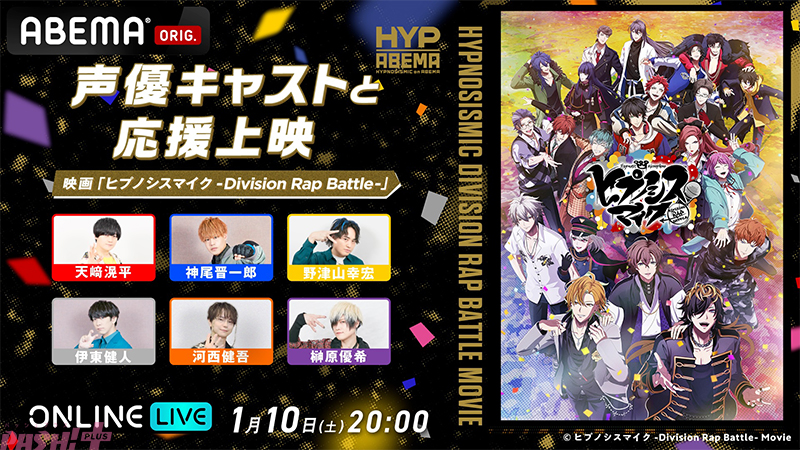 ABEMAは、“音楽原作キャラクターラッププロジェクト”『ヒプノシスマイク -Division Rap Battle-』の“重大情報を解禁”する特別番組『ヒプムビ the Party! 2026年今年もよろしくスペシャル』を、2025年1月10日(土)18時30分より独占無料生放送。同日20時からは、初の映画『ヒプノシスマイク -Division Rap Battle-』を声優キャストと一緒にお楽しみいただける応援上映会を「ABEMA PPV(アベマ ペイパービュー)」にて独占放送します。