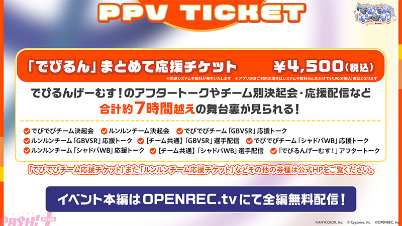 「でびるんげーむす!Supported by Cygames」のアフタートークやチーム別決起会・応援配信など合計約7時間越えの舞台裏が見られるペイ・パー・ビュー(PPV)チケットを販売中です。