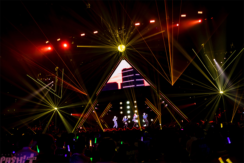 公演は定刻通りにスタート。重厚なサウンドを鳴らす生バンド演奏とレーザーが会場の温度をぶち上げ、臨界点を突破した瞬間、なんとメンバーは2階席付近に登場した。順番にスポットライトを浴びると、演奏もそれぞれの個性に合ったテイストに変化。その間、メンバーは順番にソロダンスを披露した。