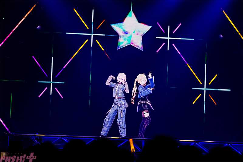 莉々華・奏のふたりは「Bangarang」のジャジーなサウンドに乗って、ステッキダンスを披露。腰を左右に揺らすセクシーな振り付けでは新衣装のミニスカがふわふわと揺れ、さらに<見当たらない安全地帯>で銃の照準を合わせるようにステッキを向ける奏の動きなど、演出装置としての振り付けも見事だ。奏はそのままステージに残り、はじめとともに「LAKI MODE」へ。身長の近い2人の新衣装は双子コーデのような可愛さがあり、ここまでクールに決めてきた歌声や表情も、曲調に合わせて可憐なものに切り替わる。