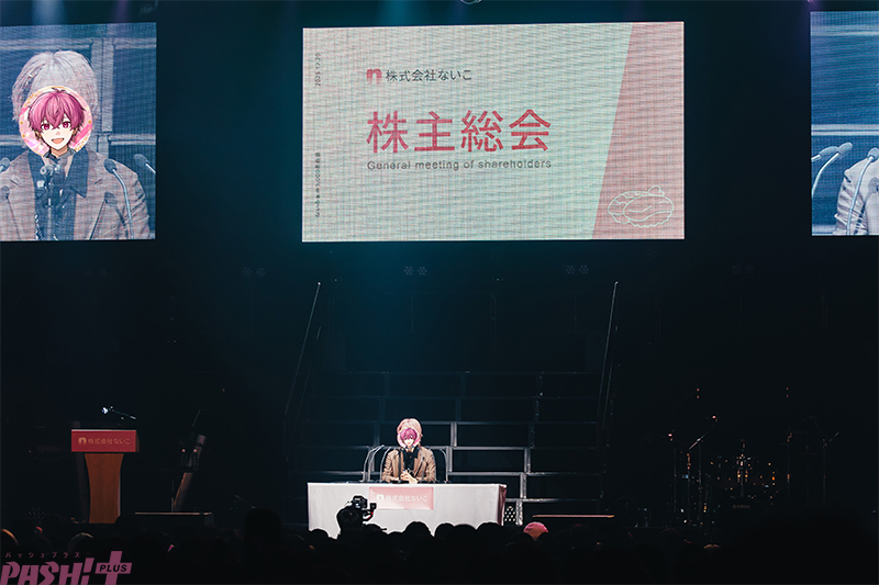 ライブが折り返しを迎えるやいなや、なんとステージ上に演台が出現。一体何が始まるのかと期待に胸を高鳴らせていると、ジャケットとメガネを装着したないこが姿を現し、『株式会社ないこ 株主総会』がスタートした。本格的な株主総会風の進行が繰り広げられるなか、内容は平均睡眠時間や体重の話題など、ないふぁみが楽しめるないこならではのキャッチーでユーモアに溢れた内容。現在の体重が公開された際には、ないこは慌てふためき「絶対にレポに書くなよ~!」とフリか本音かわからない発言を繰り出していた。