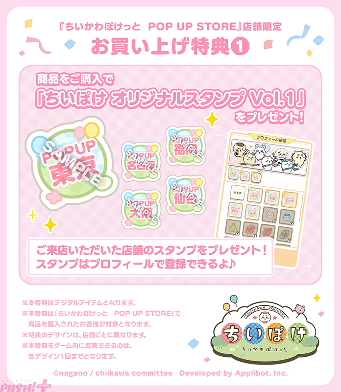 『ちいかわぽけっと POP UP STORE』にて商品をお買い上げのお客様に、「ちいぽけ オリジナルスタンプ Vol.1」をプレゼントします。