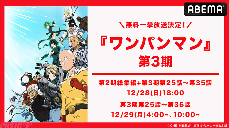 また、「ABEMA」にてアニメ『ワンパンマン』第3期の一挙放送が決定。既にご視聴いただいているファンの皆様はもちろん、まだご覧になったことがない方もぜひこの機会に『ワンパンマン』をお楽しみください! また、「ABEMA ビデオ」にてアニメ『ワンパンマン』第2期総集編及び第3期第1話(#25)~第11話(#35)までの無料視聴が可能となります。