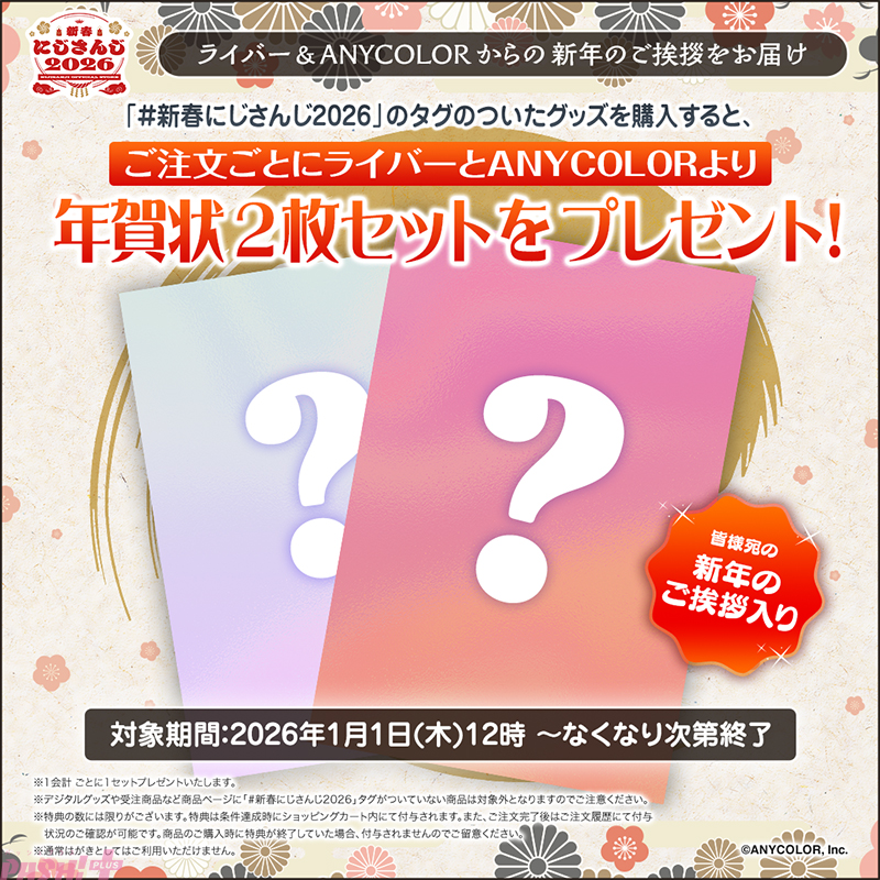 「#新春にじさんじ2026」のタグのついたグッズを購入すると、ご注文ごとにライバーとANYCOLOR株式会社より、皆様宛の新年のご挨拶を添えた「年賀状 2枚セット」をプレゼントいたします。