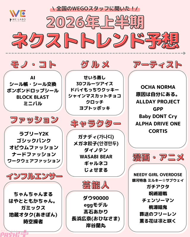 2026年上半期に流行りそうなネクストトレンドを見つけるべく、全国のWEGOスタッフに大調査を実施し、インフルエンサー、漫画・アニメ、ビューティーなど、さまざまなジャンルから「これは来る!」と噂のコンテンツをスタッフのコメントと共に紹介しています。