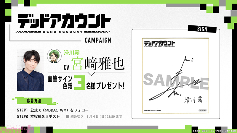 また、滑川霧役・宮﨑雅也さんのサイン入り色紙プレゼントキャンペーンが実施中。キャンペーン詳細は公式X(旧Twitter)をご確認の上、ぜひご参加ください。