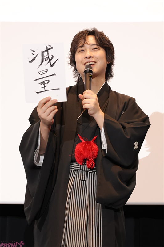 また、2026年1発目の舞台挨拶ということで、新年らしく、作品として10周年の節目を迎え、ここからさらに歩みを進めようという2人から、『今年の抱負』が書初めにてそれぞれ発表されました。先ずは菱田が袖から抱負を書かれた色紙を取り出すと、そこには『引退』の文字が。まさかの表明に「えぇ~!!」と驚きの声が上がる中、「もう僕が舞台挨拶に出るのはそろそろいいだろう。タツノコプロのアニメプロデューサーにバトンを渡そう」と詳細を説明するも、納得いかないとばかりにざわつく会場。すると菱田は「これだと怒られると思ったから……」とすかさず、2枚目の抱負『休』の文字を取り出し、最終的には3枚目『健康』の抱負を発表しました。「こうして続けられたのも健康だからこそ。引き続き健康でいたいです。」と表明し、会場からは温かい拍手が起こりました。