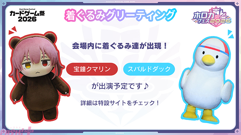 そして、イベント当日は対戦エリアにはホロライブの着ぐるみ、「宝鐘クマリン」と「スバルドダック」が登場し、来場者とのグリーティングを行います。スケジュールは後日公開予定です。