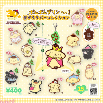 2026年にデビュー30周年を迎えたポムポムプリン。30周年にちなんで、Part1とPart2それぞれ15種ずつ、合わせて全30種のラバーコレクションが登場。コレクション心をくすぐるラインアップは、おっきなプリンのぬいぐるみにぎゅっと抱きつく姿の「プリンだってだきつきプリン」や、王冠を被ったポムポムプリンの復刻デザイン「マジカルプリン 2026」など、一部はアニバーサリーデザインです。
