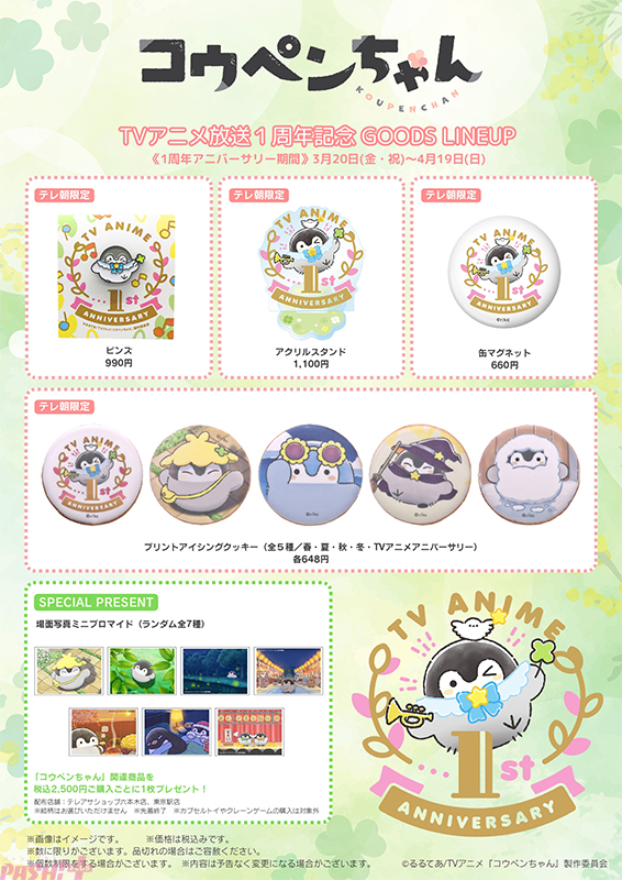 1周年記念ロゴをデザインした、テレビ朝日限定グッズの発売が決定しました。アニバーサリーにぴったりな「ピンズ」をはじめ、「缶マグネット」「アクリルスタンド」が登場。さらに、コウペンちゃんと過ごした春夏秋冬の思い出を振り返る「プリントアイシングクッキー」が完成しました。