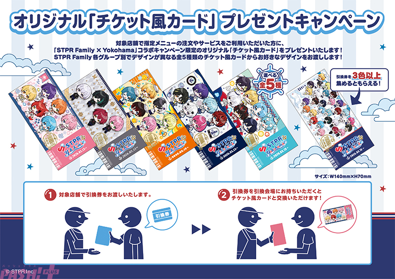 対象店舗で指定メニューの注文やサービスをご利用いただいた方に、「STPR Family×Yokohama」コラボキャンペーン限定のオリジナル「チケット風カード」をプレゼント! STPR Family各グループでデザインが異なる全5種類のチケット風カードからお好きなデザインをお渡しします。さらに、条件クリアで追加特典もご用意しています。